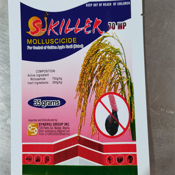Niclosamide 70% WP is fast in killing. It is a kind of molluscicide. The drug can reduce the respiration by preventing the intake of oxygen by harmful snails in water, and finally make them suffocate and die. This medicament is mainly used to control snails in rice fields. This product can also kill snail eggs.